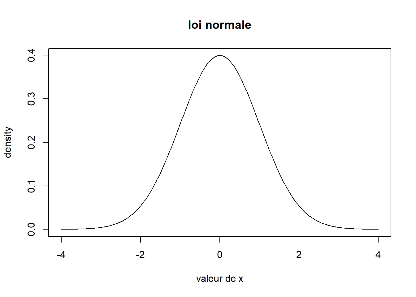 plot(x, hx, type="l", xlab = "valeur de x", ylab="density", main="loi normale")